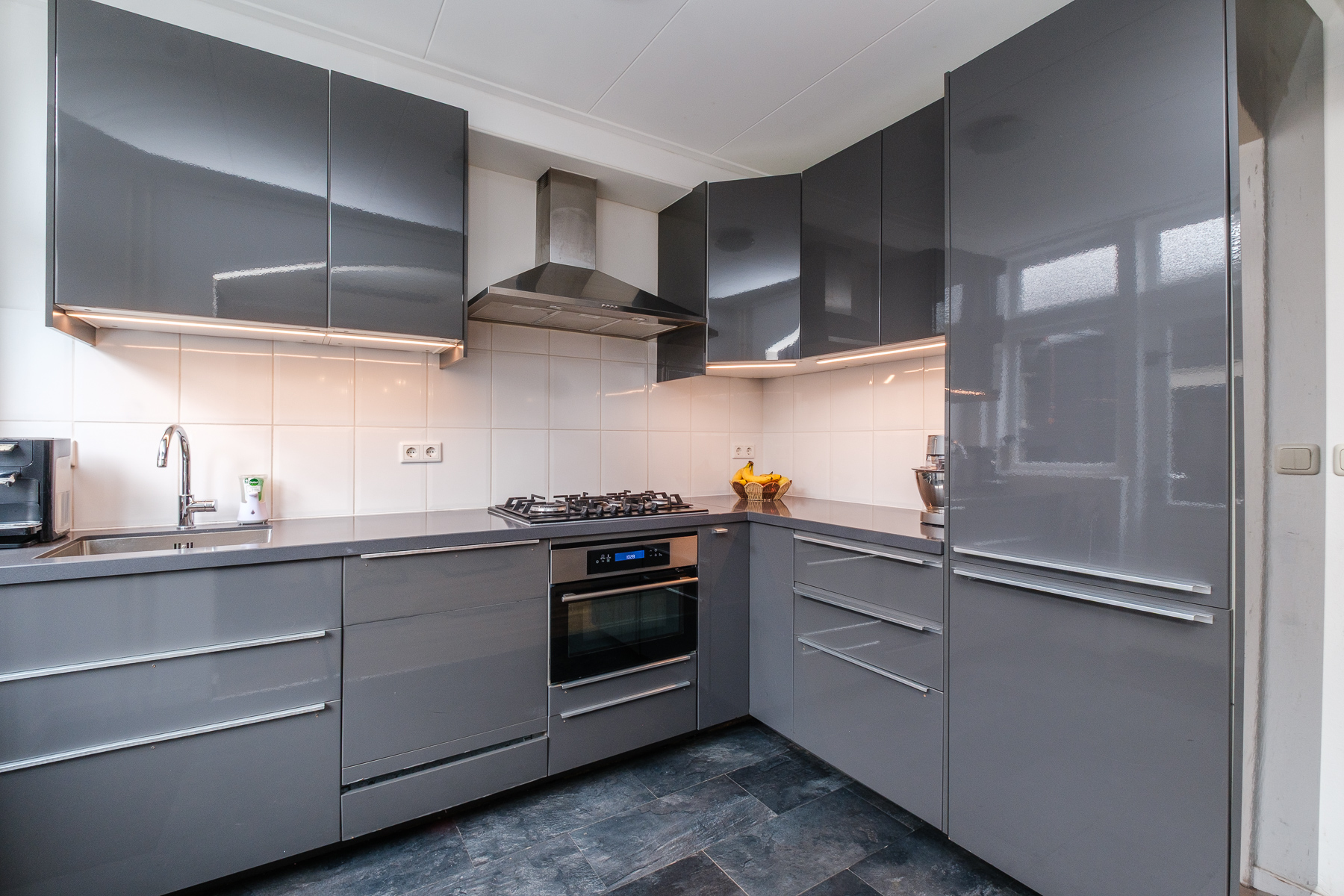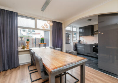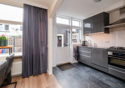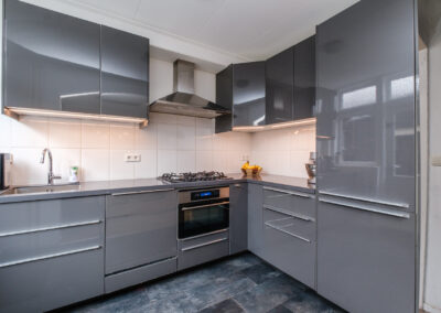 Bij binnenkomst tref je een nette entree met hal, toiletruimte en praktische kelderkast. De lichte doorzon woonkamer biedt volop leefruimte en dankzij de grote raampartijen geniet je hier van een prettige lichtinval. De half open keuken is uitgevoerd in een hoekopstelling en voorzien van alle benodigde inbouwapparatuur.
