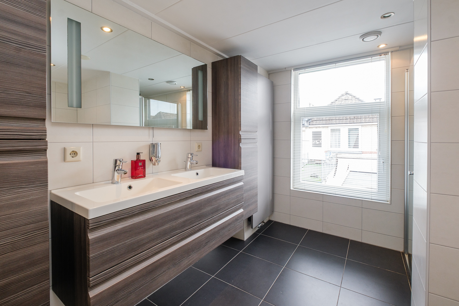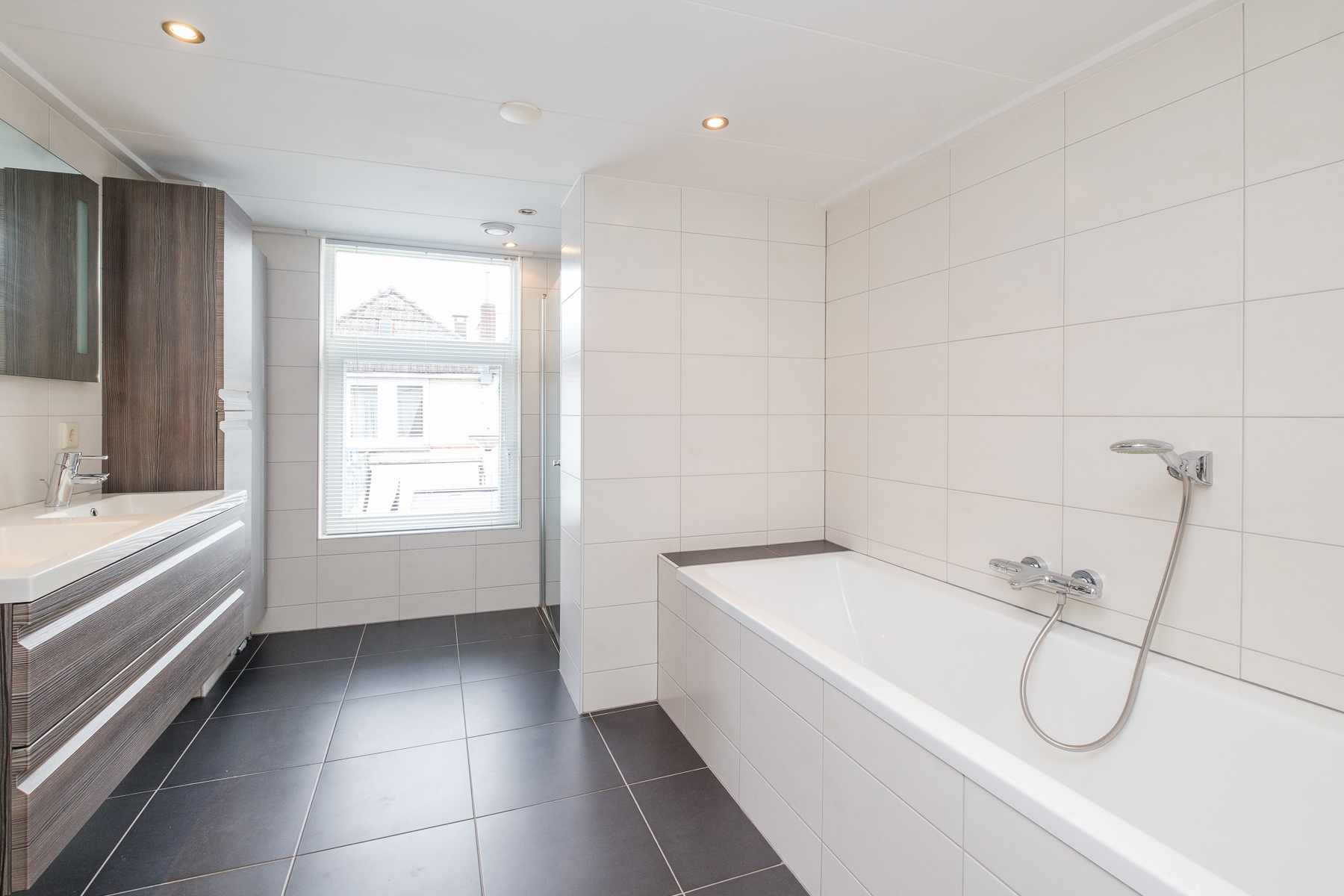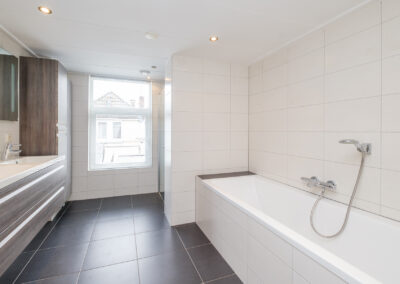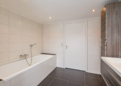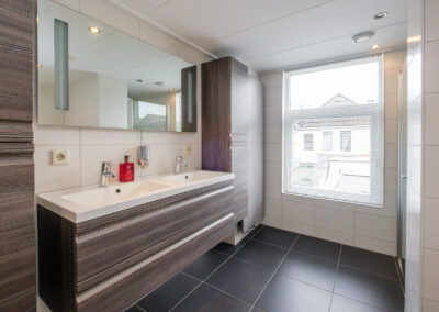 Op de eerste verdieping bevinden zich twee royale slaapkamers, waarvan één is uitgerust met een vaste schuifkastenwand en rolluik. De voormalige derde slaapkamer is opgeofferd om een royale en comfortabele badkamer te creëren. Deze is uitgevoerd in een lichte kleurstelling en beschikt over een ligbad, douchecabine en een wastafelmeubel met dubbele kranen. Daarnaast is er een moderne, separate toiletruimte én een praktische wasruimte met extra wastafel.