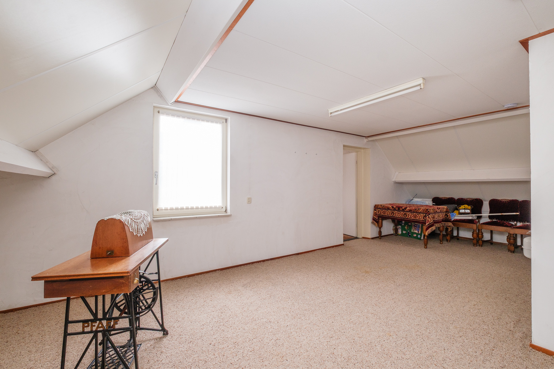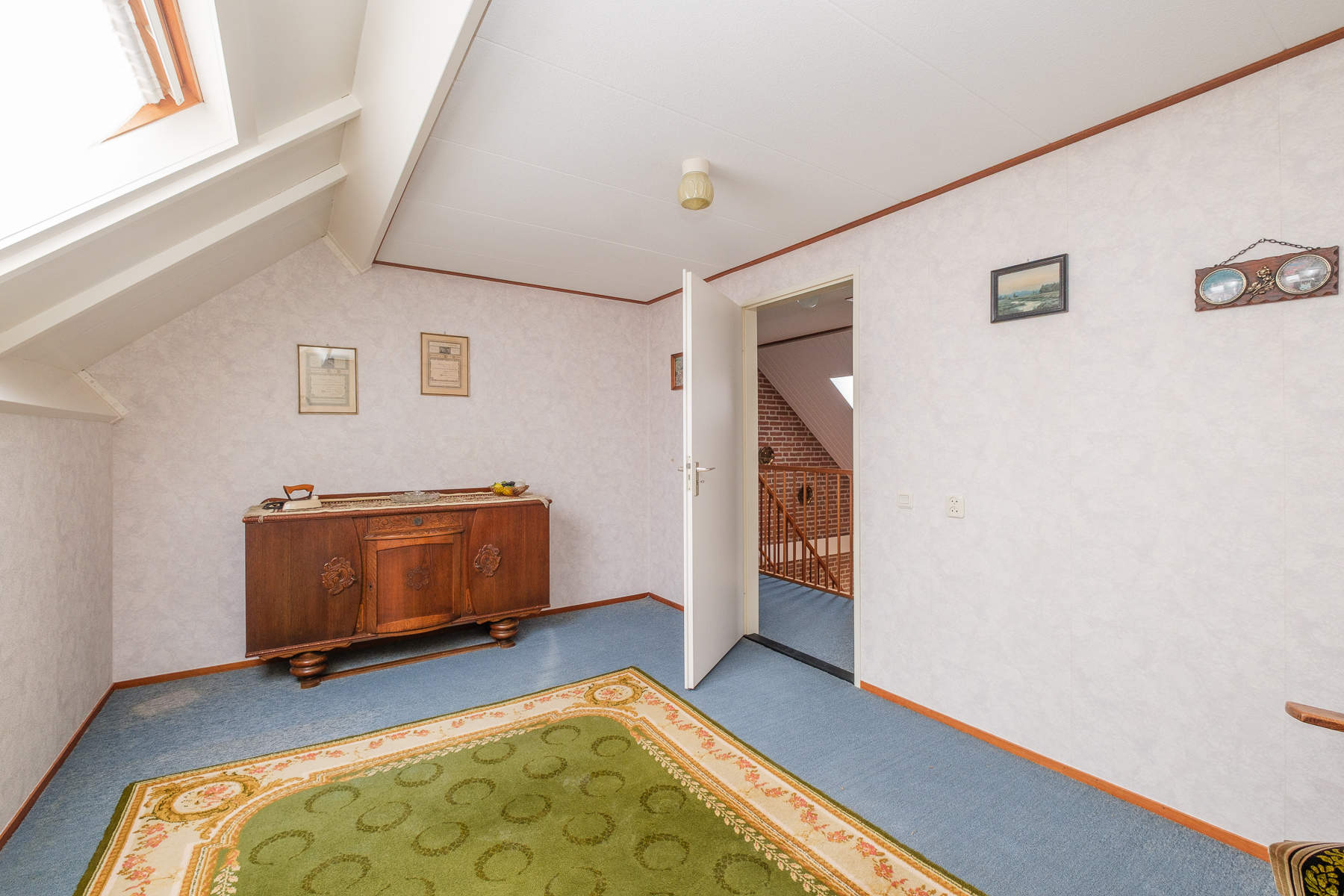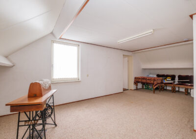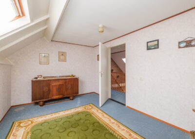 Overloop met vide, vier volwaardige slaapkamers, een tweede badkamer met douche, wastafel en tweede toilet, en een praktische berging boven de garage. Alle slaapkamers zijn voorzien van knieschotten voor het opslaan van diverse spullen.